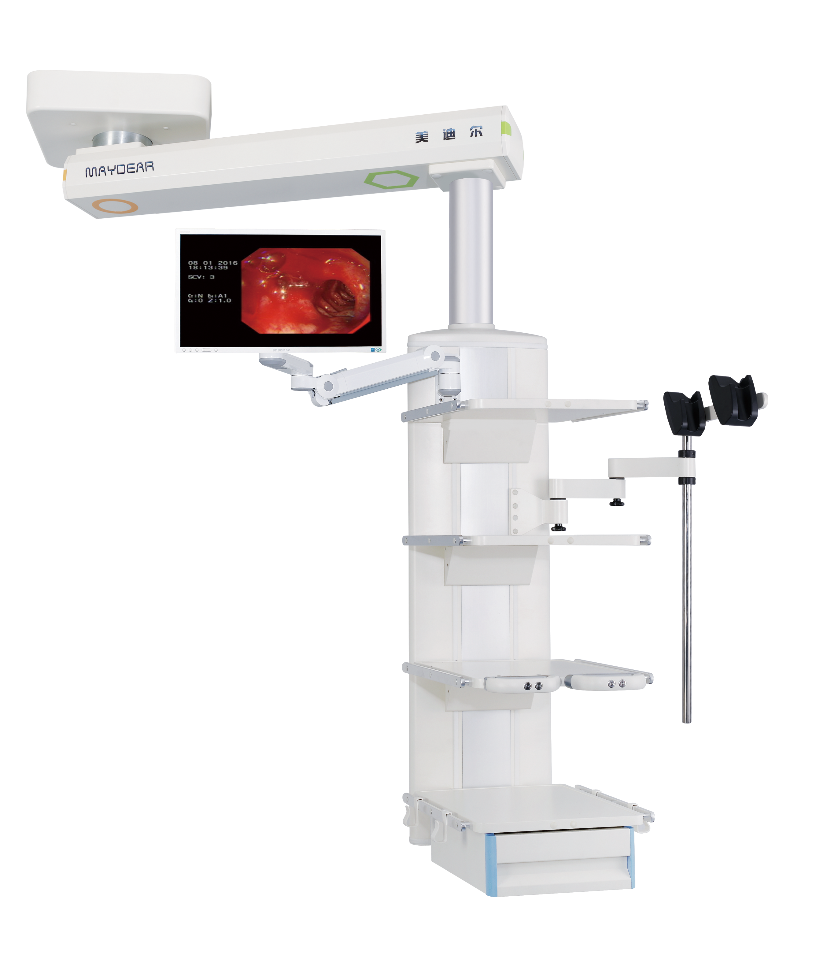 雙臂腔鏡塔是專為內(nèi)鏡中心設(shè)計(jì)的高承載能力設(shè)備,采用天花懸掛方式,塔體和高強(qiáng)度單臂能旋轉(zhuǎn),并多關(guān)節(jié)配置氣動剎車防飄移,塔身配置有多層設(shè)備平臺以及氧氣、負(fù)壓、空氣、二氧化碳等醫(yī)氣終端及電源輸入和網(wǎng)絡(luò)插座等,其操作快捷到位,輕松自如。