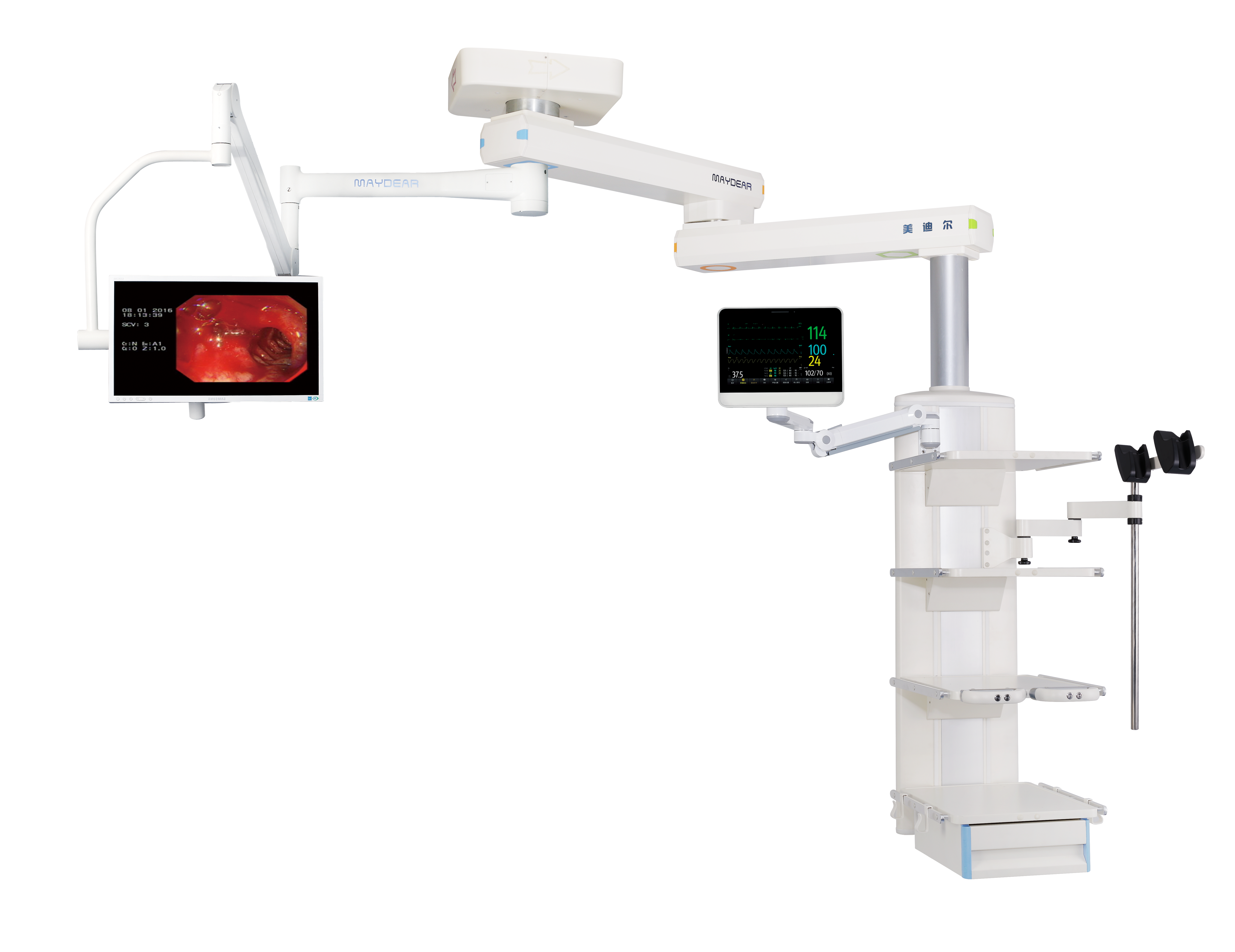 雙臂腔鏡塔是專為大型手術(shù)室設(shè)計(jì)的高承載能力設(shè)備,采用天花懸掛方式,多關(guān)節(jié)任意旋轉(zhuǎn),并多關(guān)節(jié)配置氣動剎車防漂移,塔身配置有多層設(shè)備平臺以及氧氣、負(fù)壓、空氣、二氧化碳等醫(yī)用終端及電源輸入和網(wǎng)絡(luò)插座等,其操作快捷到位,輕松自如。